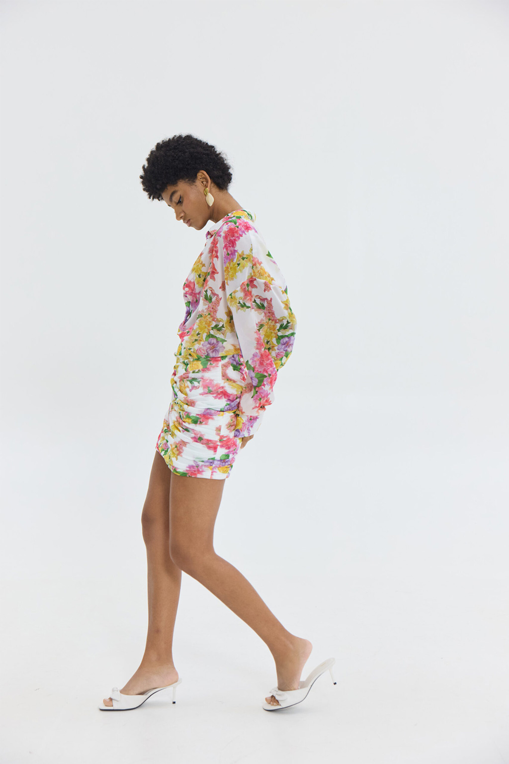 ini φούστα με degrade λουλούδια σε λευκό φόντο, mesh ύφασμα, σούρες, στενό fit, ψηλόμεση, φερμουάρ, 95% PL 5% EL.