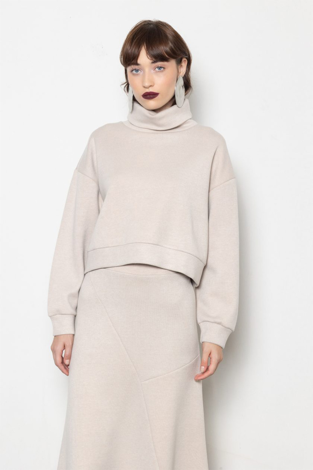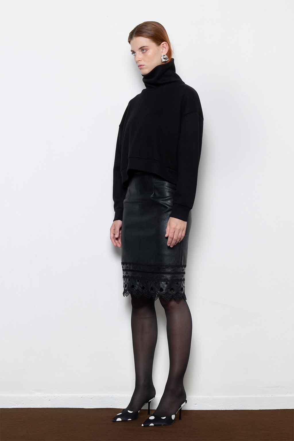 Φούστα σε γραμμή pencil από συνθετικό δέρμα με δαντελένιο τελείωμα — κομψή, θηλυκή και απόλυτα εκλεπτυσμένη. Ύφασμα: 30% Πολυουρεθάνη, 70% Πολυεστέρας. Το μοντέλο φοράει μέγεθος S.