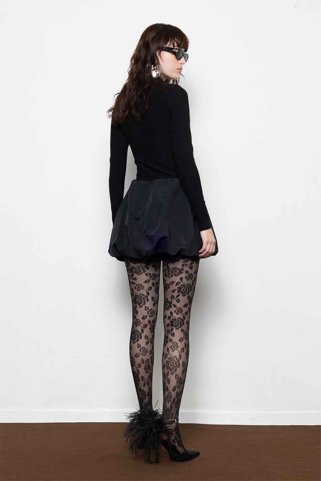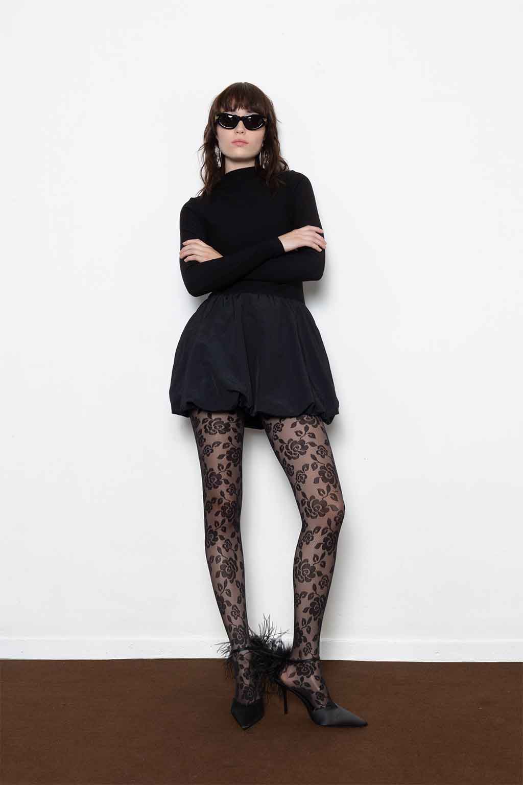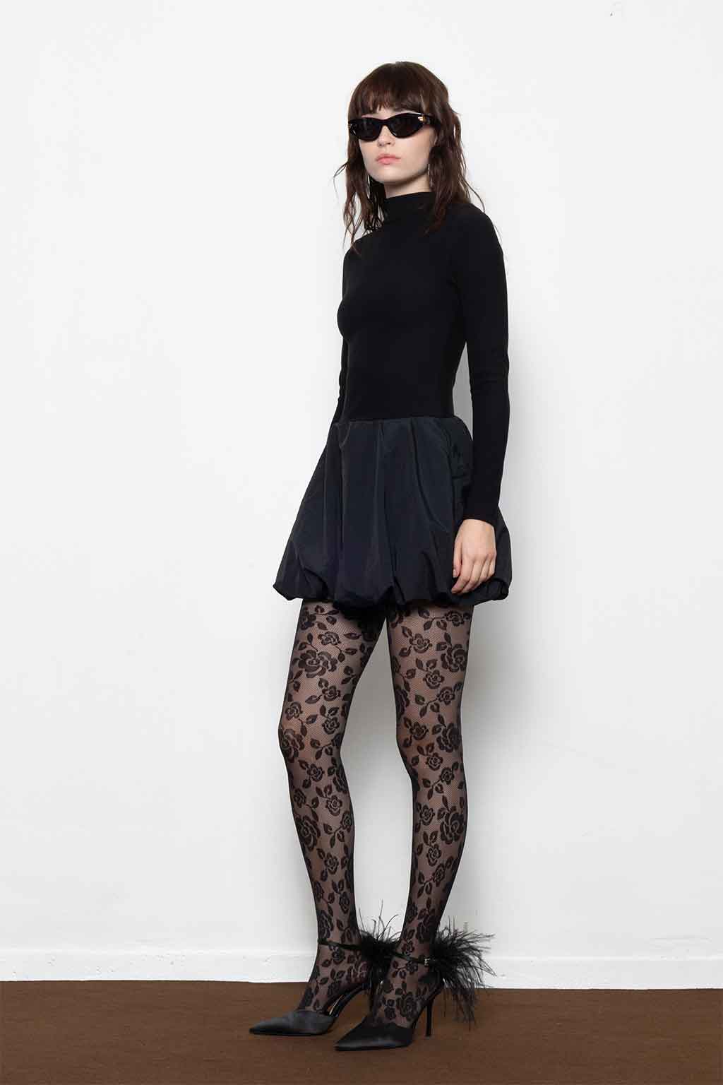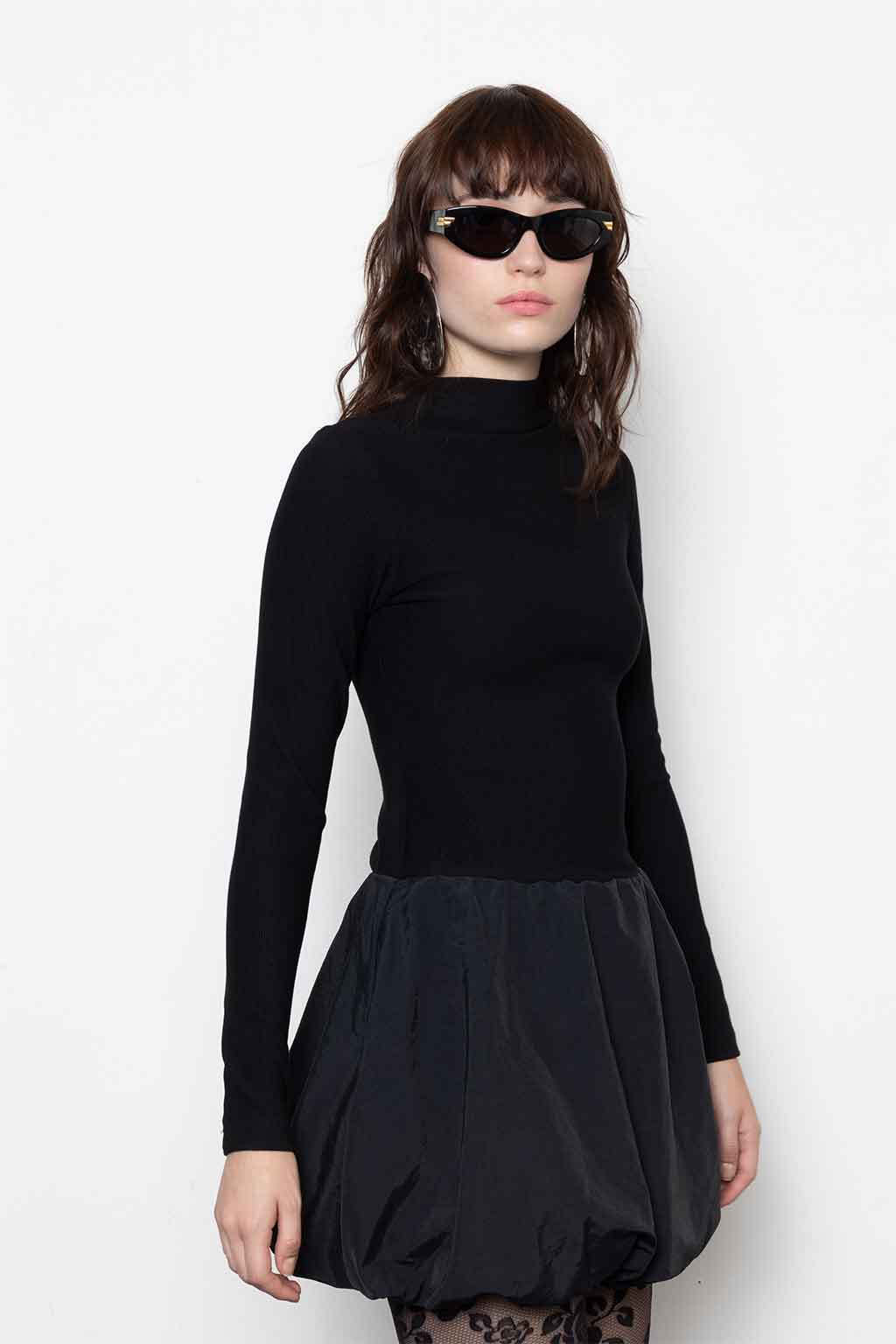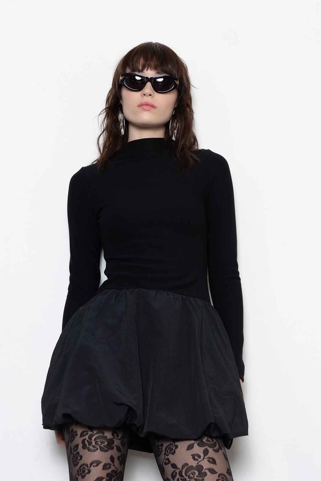 Μαύρο μίνι φόρεμα με balloon φούστα, ψηλό λαιμό και δομημένη σιλουέτα — μίνιμαλ στο επάνω μέρος, εντυπωσιακό στο κάτω. Ύφασμα: 52% Ράιον, 41% Πολυαμίδιο, 7% Spandex (κορμός) & 100% Πολυαμίδιο (φούστα). Το μοντέλο φοράει μέγεθος S.