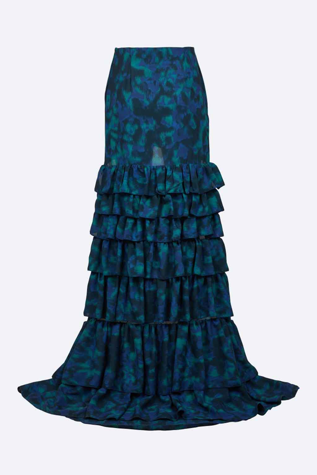 Ασύμμετρη, πολυεπίπεδη μάξι φούστα με βολάν και ψηλό σκίσιμο· το σκούρο abstract μοτίβο και η εντυπωσιακή ουρά χαρίζουν γλυπτική αίσθηση.