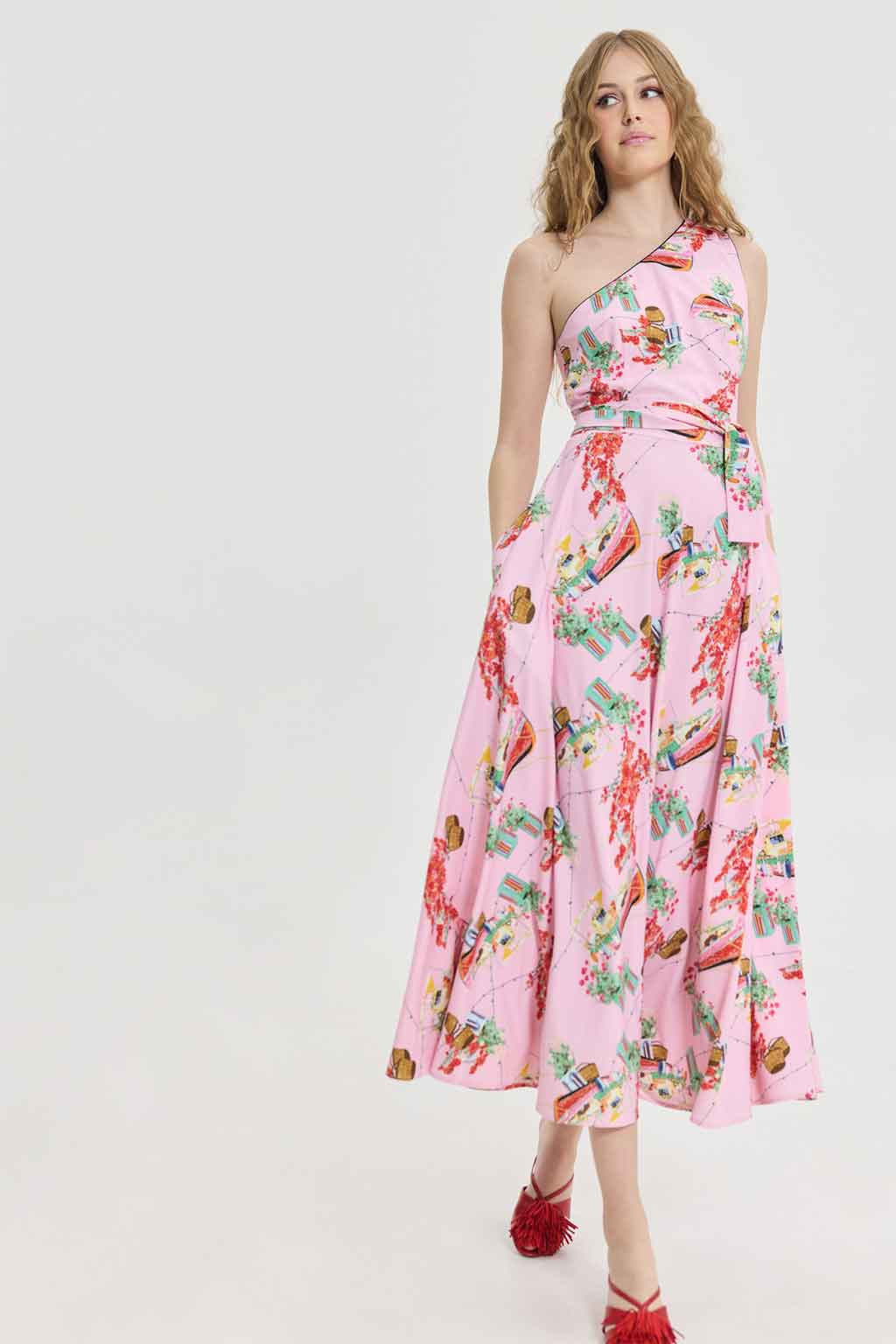 Φόρεμα με έναν ώμο, summer memories pattern, αέρινη φούστα, ζώνη, τσέπες, μήκος αστραγάλου, 95% PL 5% LY.
