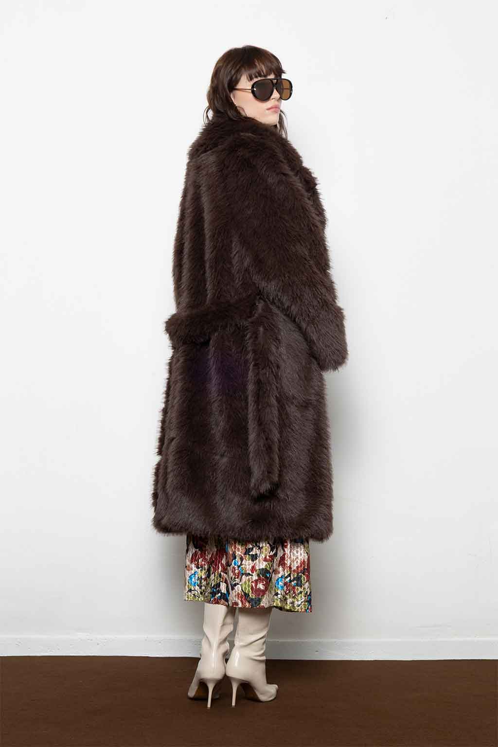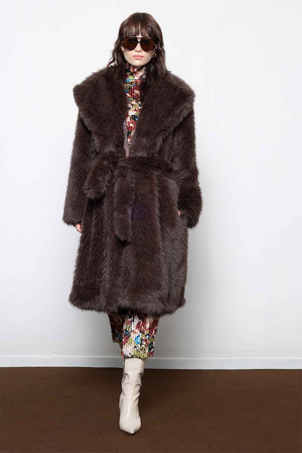 Παλτό από αφράτη συνθετική γούνα με oversized γιακά και ζώνη στη μέση — τολμηρό, ζεστό και αφοπλιστικά πολυτελές. Ύφασμα: 100% Πολυεστέρας. Το μοντέλο φοράει μέγεθος S.