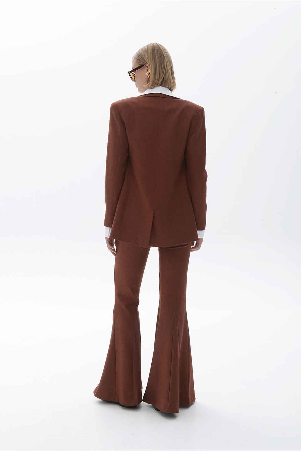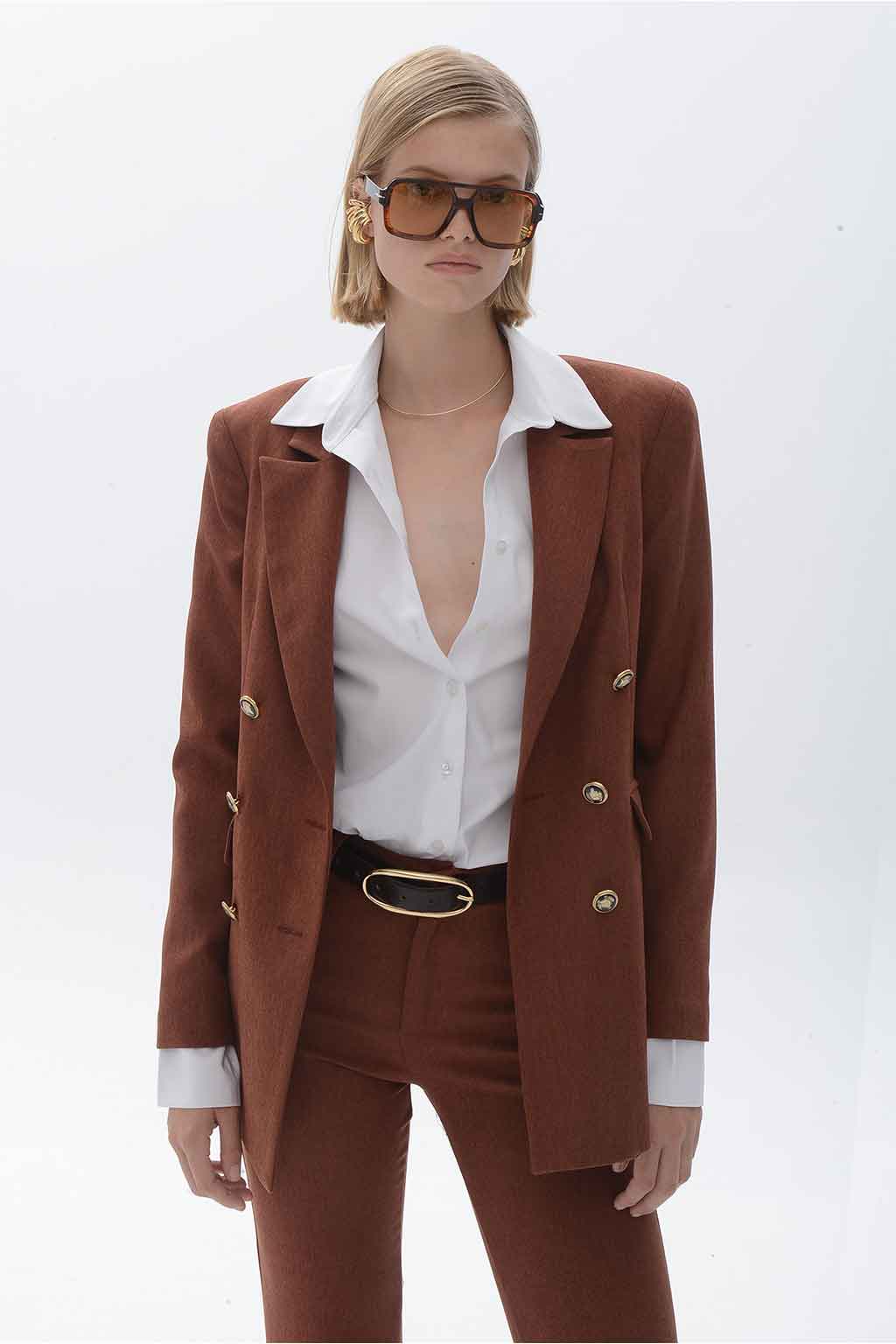 Clay blazer — διπλόπετο σακάκι σε βαθύ clay καφέ με μεταλλικά κουμπιά, structured ώμους και τονισμένη μέση για κολακευτική, σύγχρονα εκλεπτυσμένη σιλουέτα.