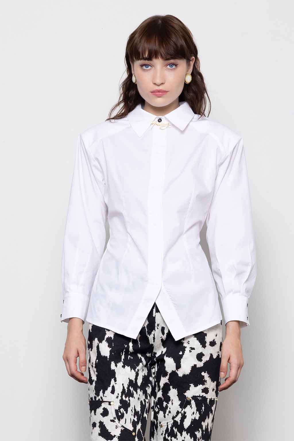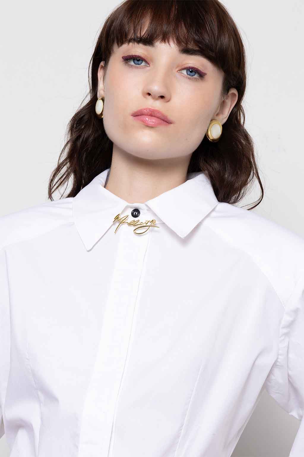 Λευκό πουκάμισο από ποπλίνα με δομημένους ώμους και χρυσή λεπτομέρεια λογότυπου στον γιακά — κομψό, εκλεπτυσμένο και δυναμικά θηλυκό. Ύφασμα: 97% Βαμβάκι, 3% Spandex. Το μοντέλο φοράει μέγεθος S.
