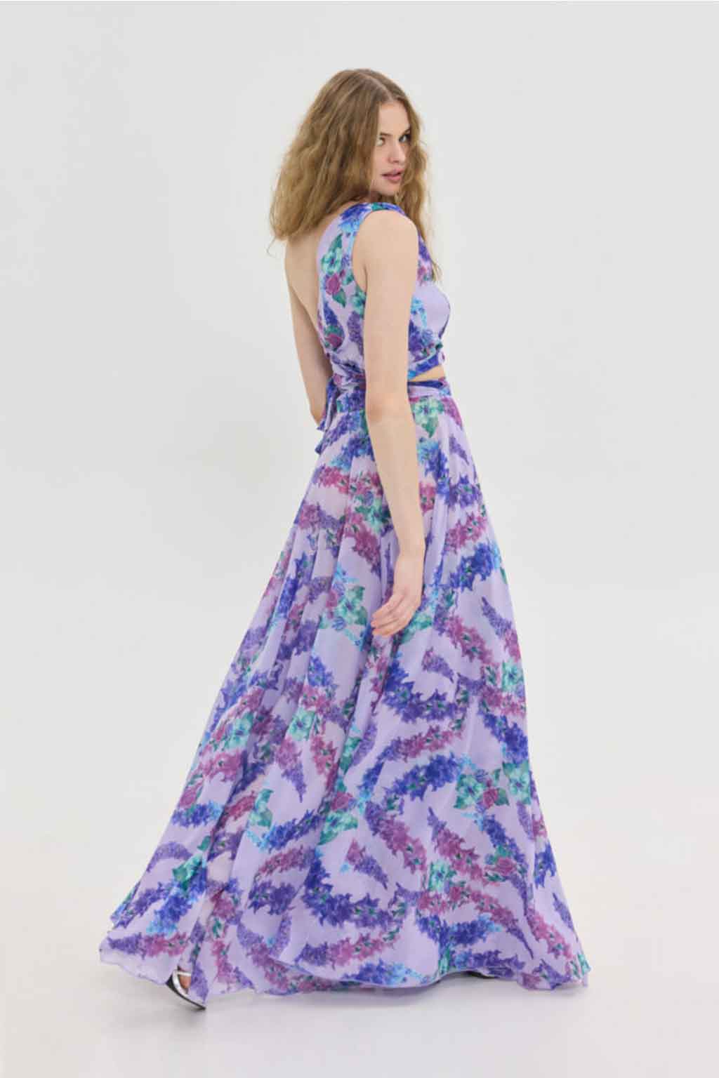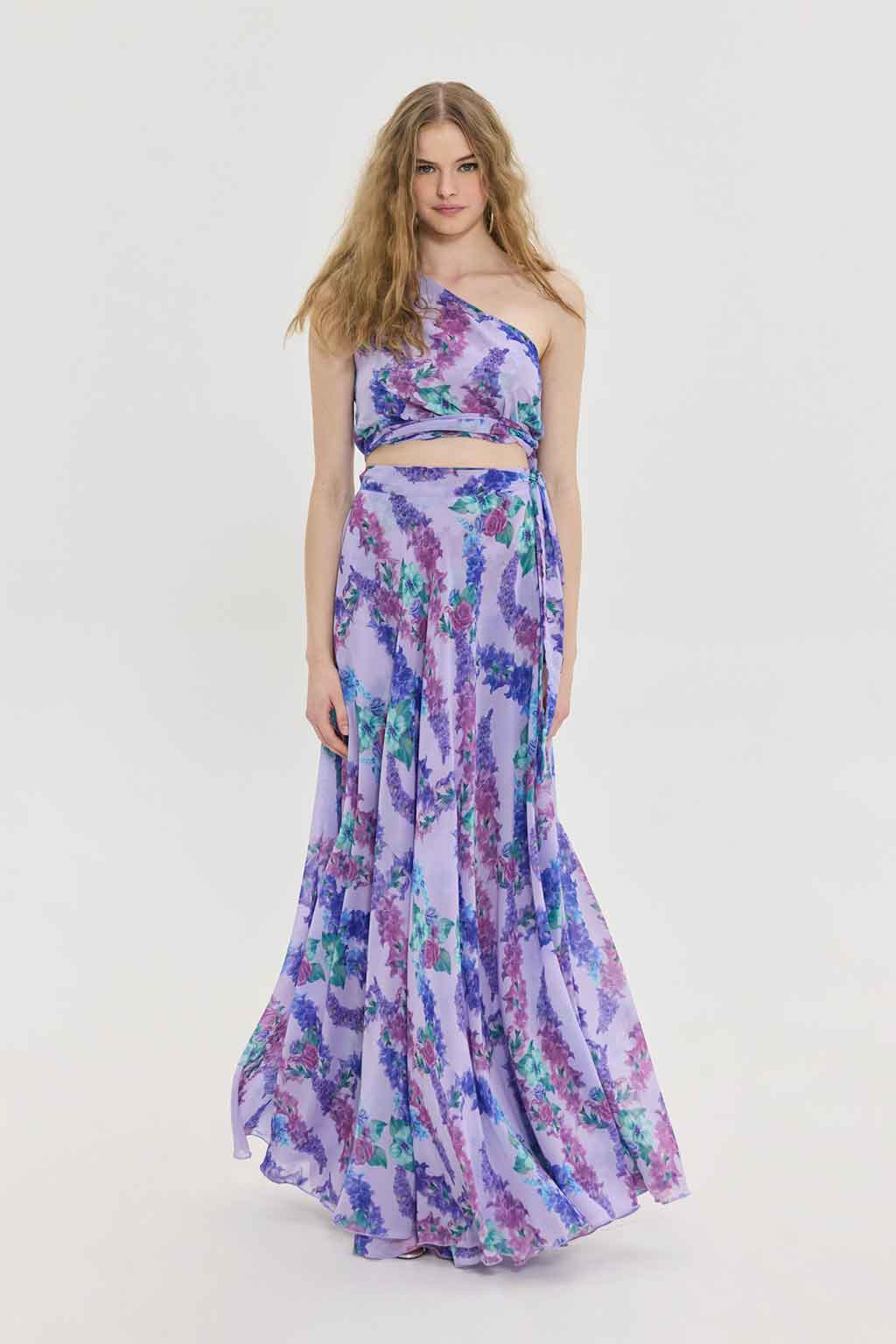 Maxi αέρινη φούστα, floral pattern μωβ, wrap κλείσιμο, αέρινη fit, αποσπώμενη φόδρα 100% PL.
