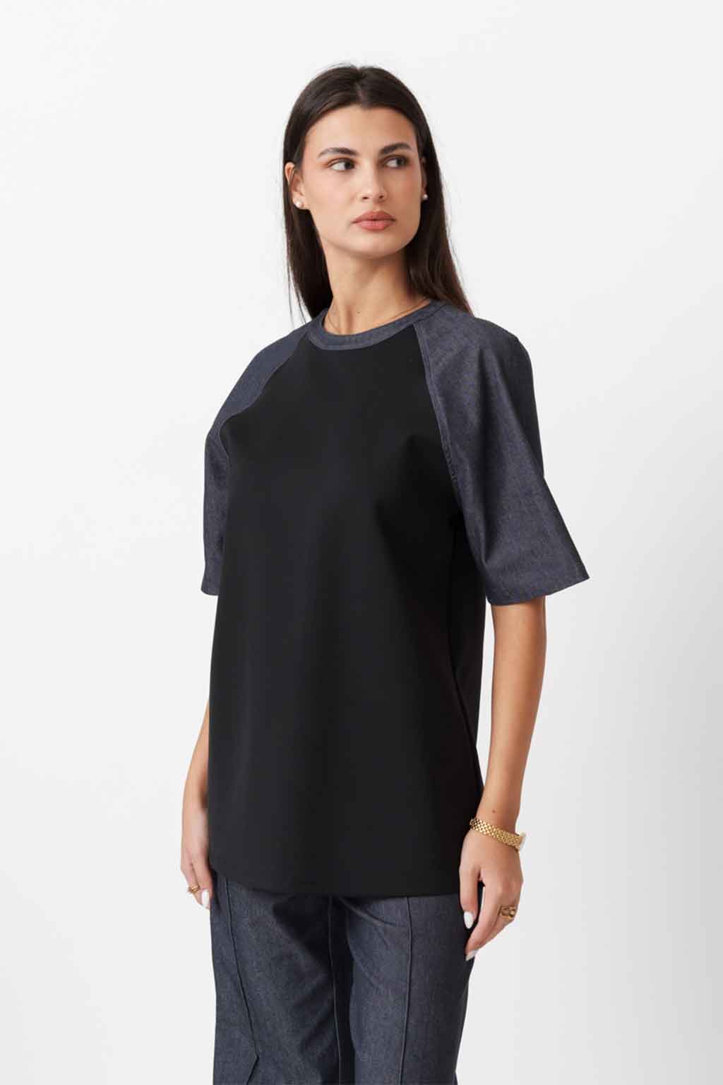 T-shirt με μανίκια denim-look και καθαρή γραμμή για μοντέρνο, καθημερινό στιλ. Άνετη, ελαστική εφαρμογή—φοριέται μόνο του ή κάτω από σακάκι για χαλαρό smart-casual αποτέλεσμα. Σύνθεση: 52% Βαμβάκι (CO), 40% Πολυαμίδιο (PA), 8% Ελαστάνη (SP)