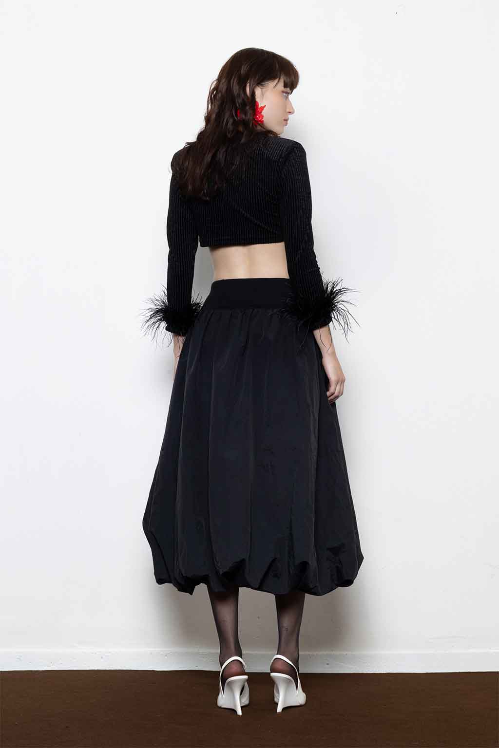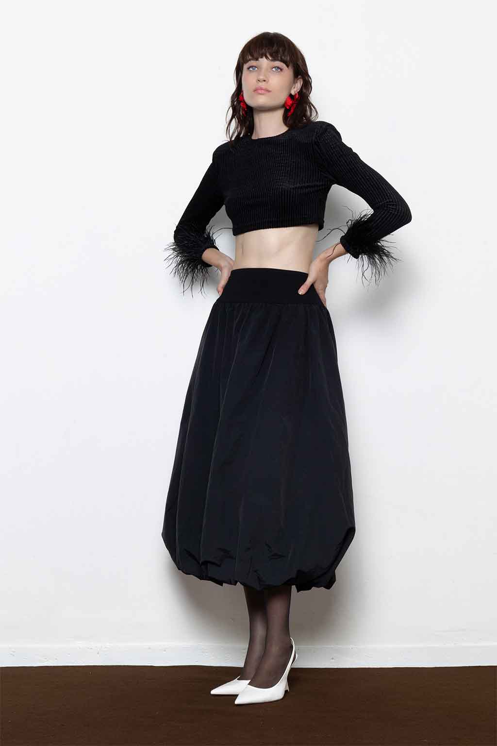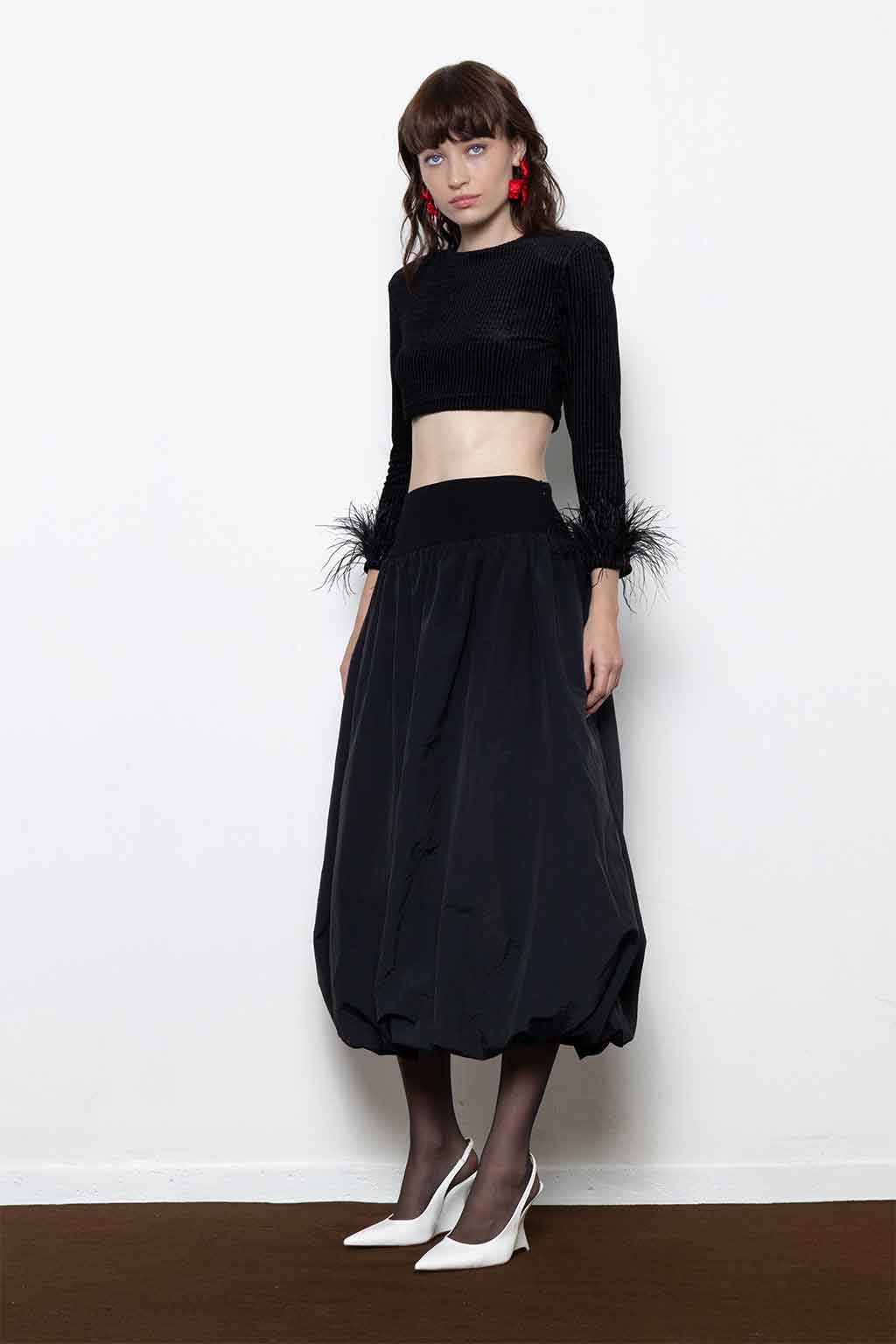 Voluminous charm. Ψηλόμεση balloon φούστα που χαρίζει παιχνιδιάρικη δομή σε κάθε look με τη μαλακά σουρωμένη σιλουέτα και το γλυπτικό τελείωμά της. Ύφασμα: 100% Πολυαμίδιο & 68% Ράιον, 27% Πολυαμίδιο, 5% Spandex. Το μοντέλο φοράει μέγεθος S.