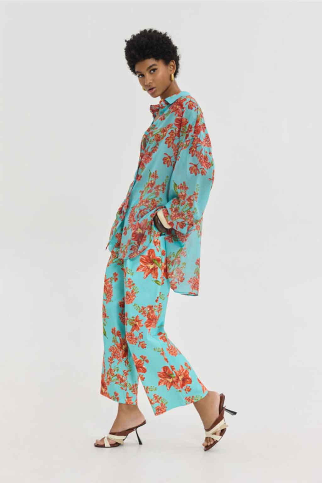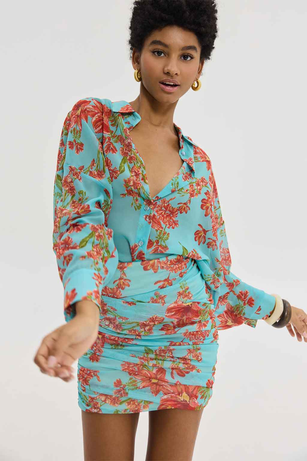 Oversized, αέρινο πουκάμισο από 100% Rec PL, με παραμυθένιο pattern σε γαλάζιες αποχρώσεις, γιακά, σούρα στην πλάτη, και μανίκια με μανσέτες.