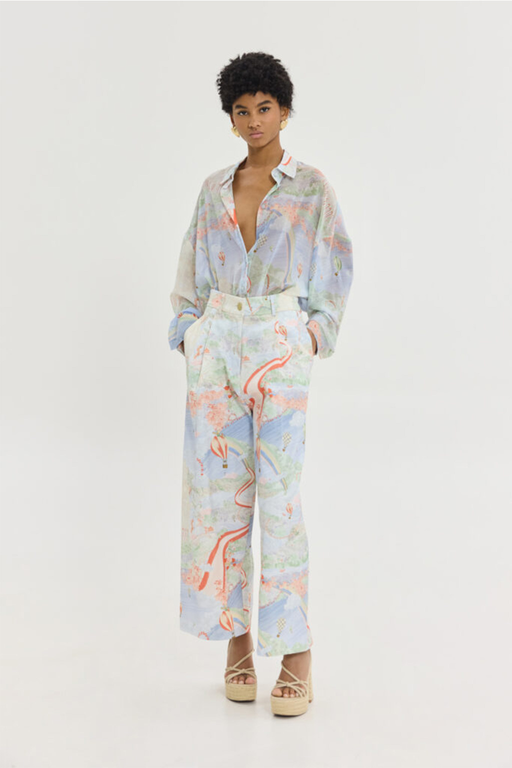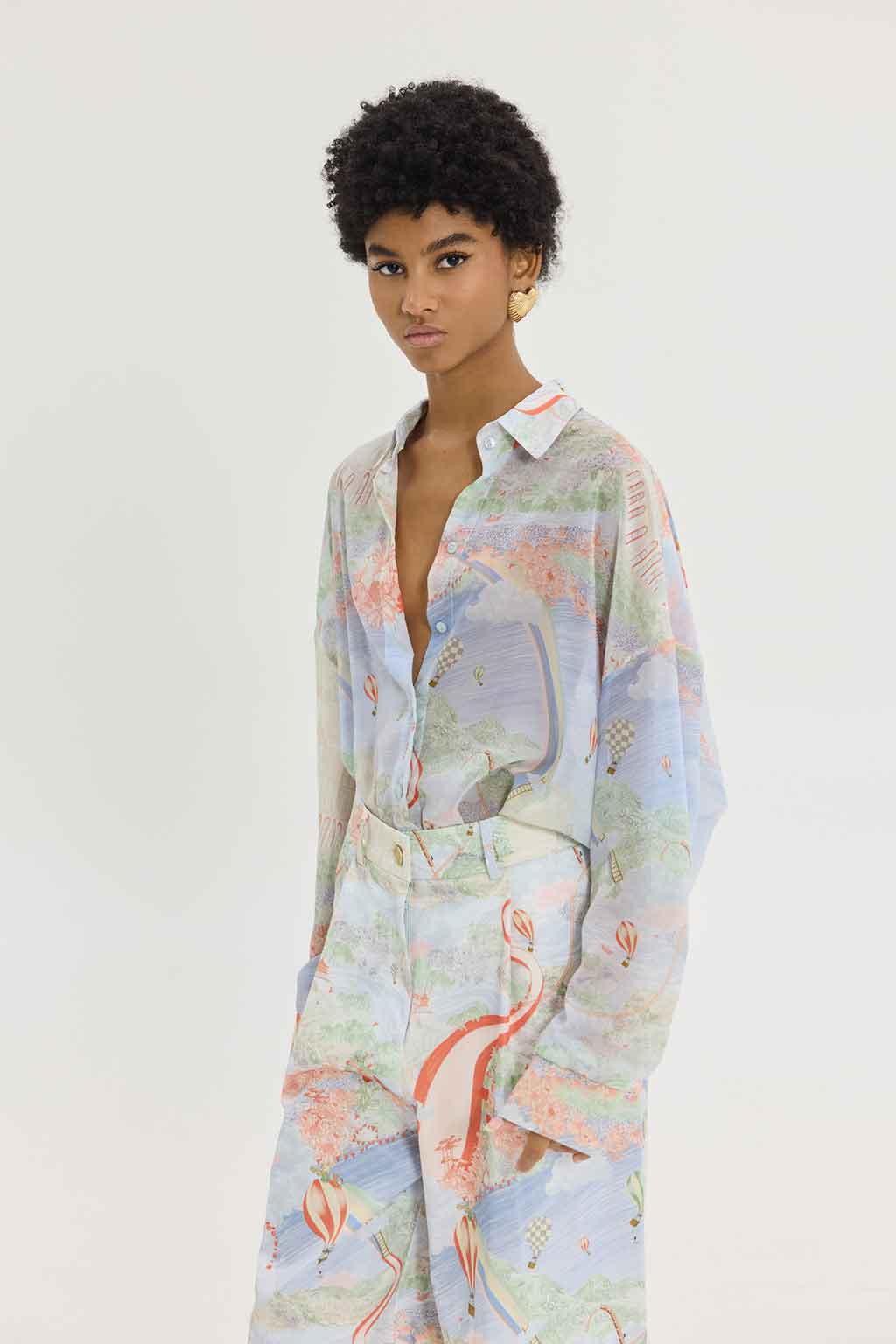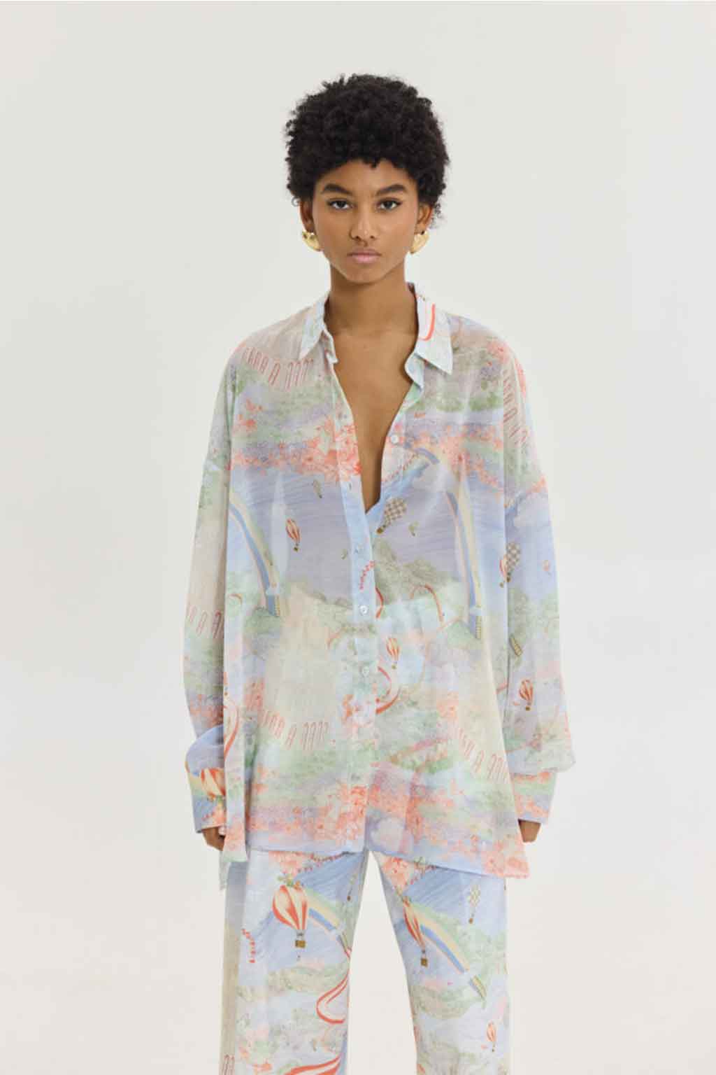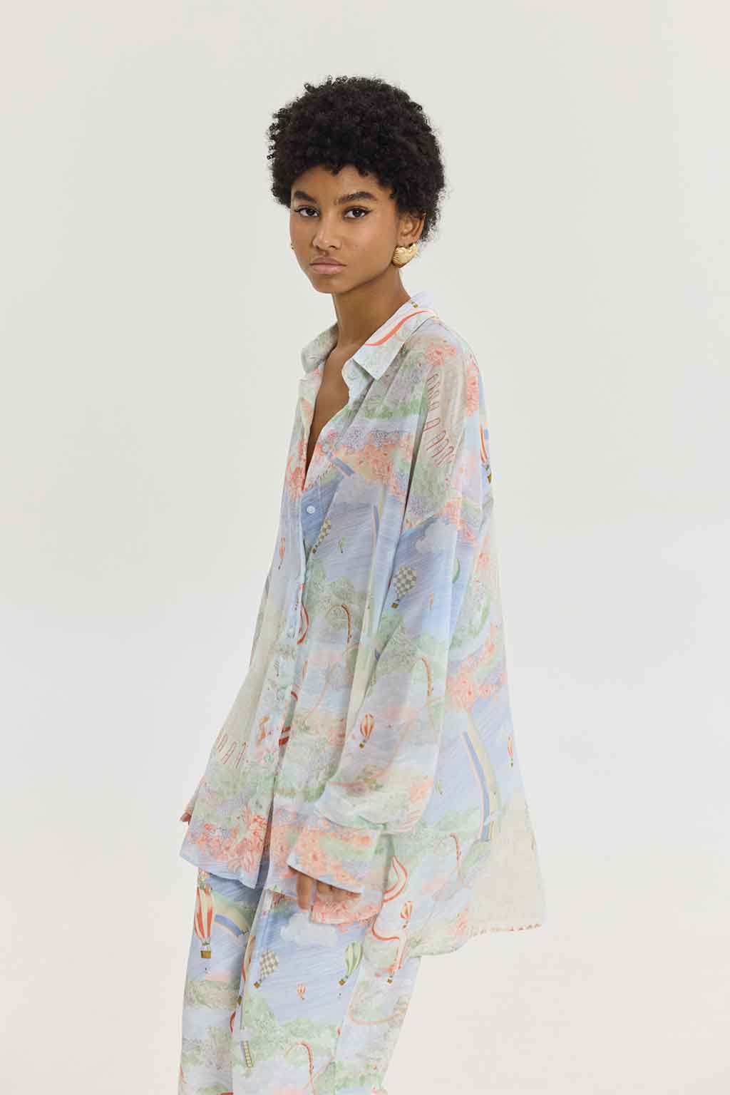 Oversized, αέρινο πουκάμισο από 100% Rec PL, με παραμυθένιο pattern σε γαλάζιες αποχρώσεις, γιακά, σούρα στην πλάτη, και μανίκια με μανσέτες.