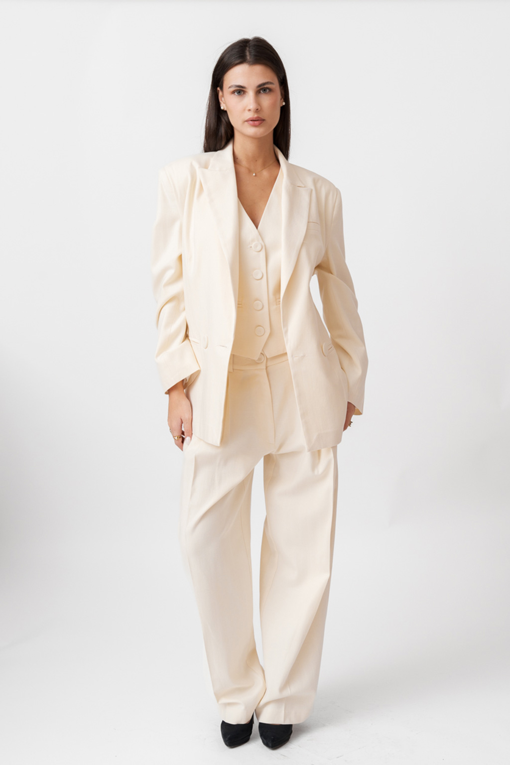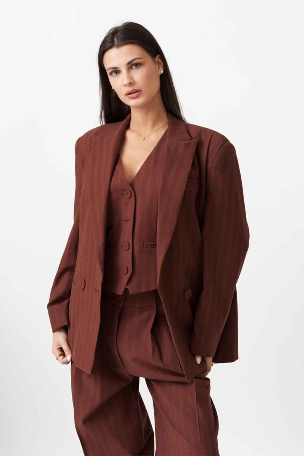 Μπλέιζερ herringbone (ψαροκόκαλο) με κομψή, καθαρή γραμμή—ιδανικό για smart-casual εμφανίσεις από το πρωί έως το βράδυ. Απαλή υφή με όμορφη πτώση και άνεση στην κίνηση. Σύνθεση: 54% Λυοσέλ (Lyocell), 46% Βαμβάκι