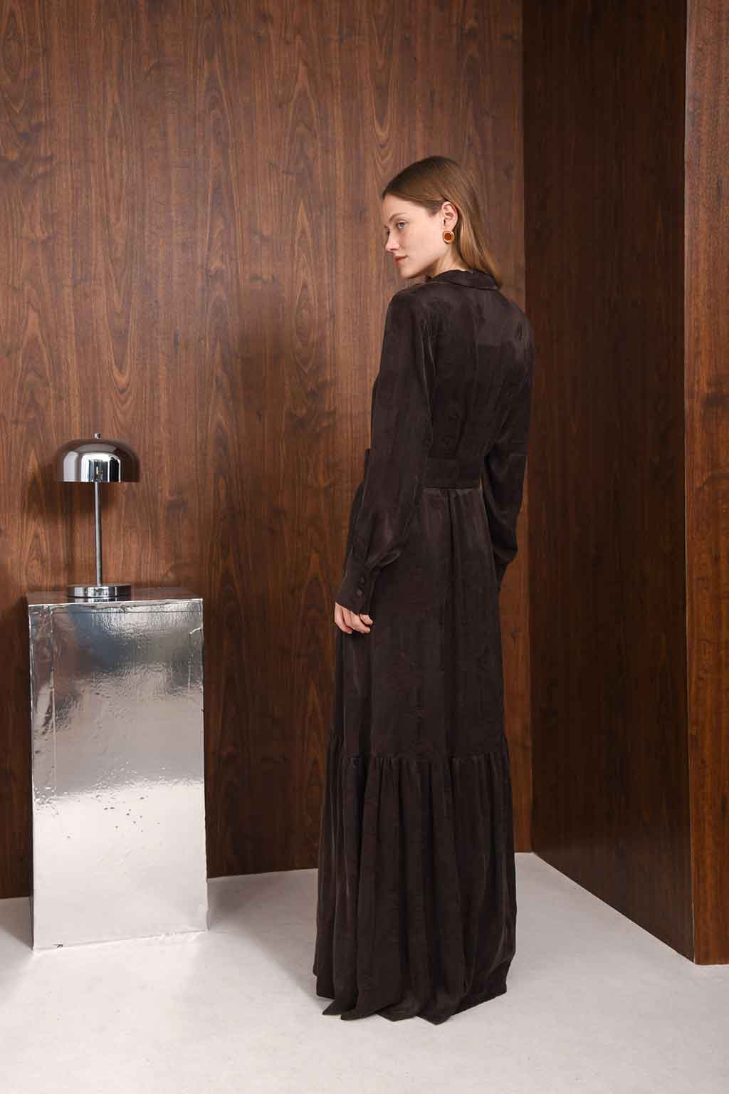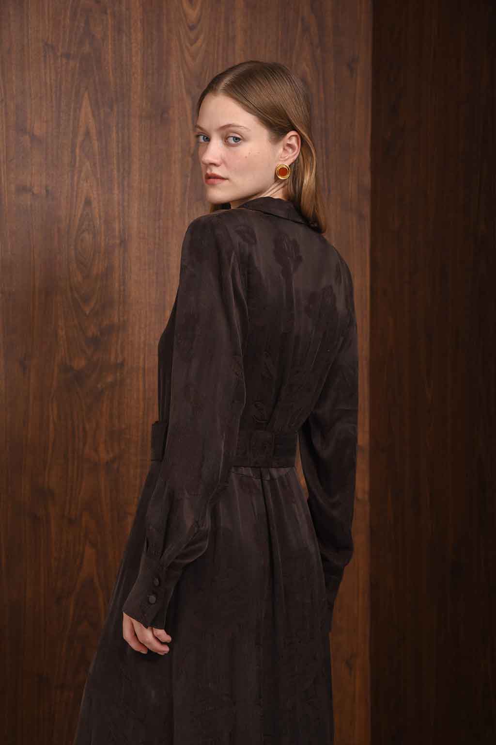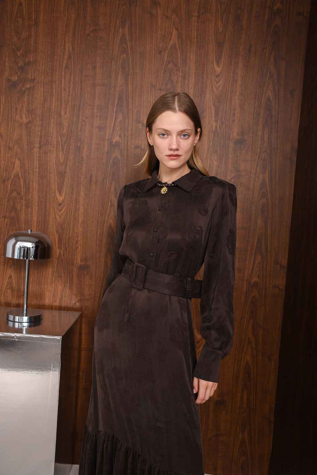 Inner Voice dress — σύγχρονο φόρεμα με τονισμένη μέση και ρευστή κίνηση, ισορροπία μινιμαλισμού και θηλυκότητας.