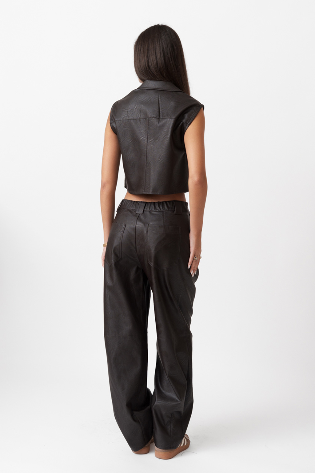Παντελόνι leather look με minimal αισθητική και απαλή υφή. Συνδυάζεται εύκολα με σακάκι ή oversized πουκάμισο για κομψό, σύγχρονο look όλη την ημέρα. Σύνθεση: 66% Ανακυκλωμένη Πολυουρεθάνη (REC.PU), 34% Βισκόζη (VIS)