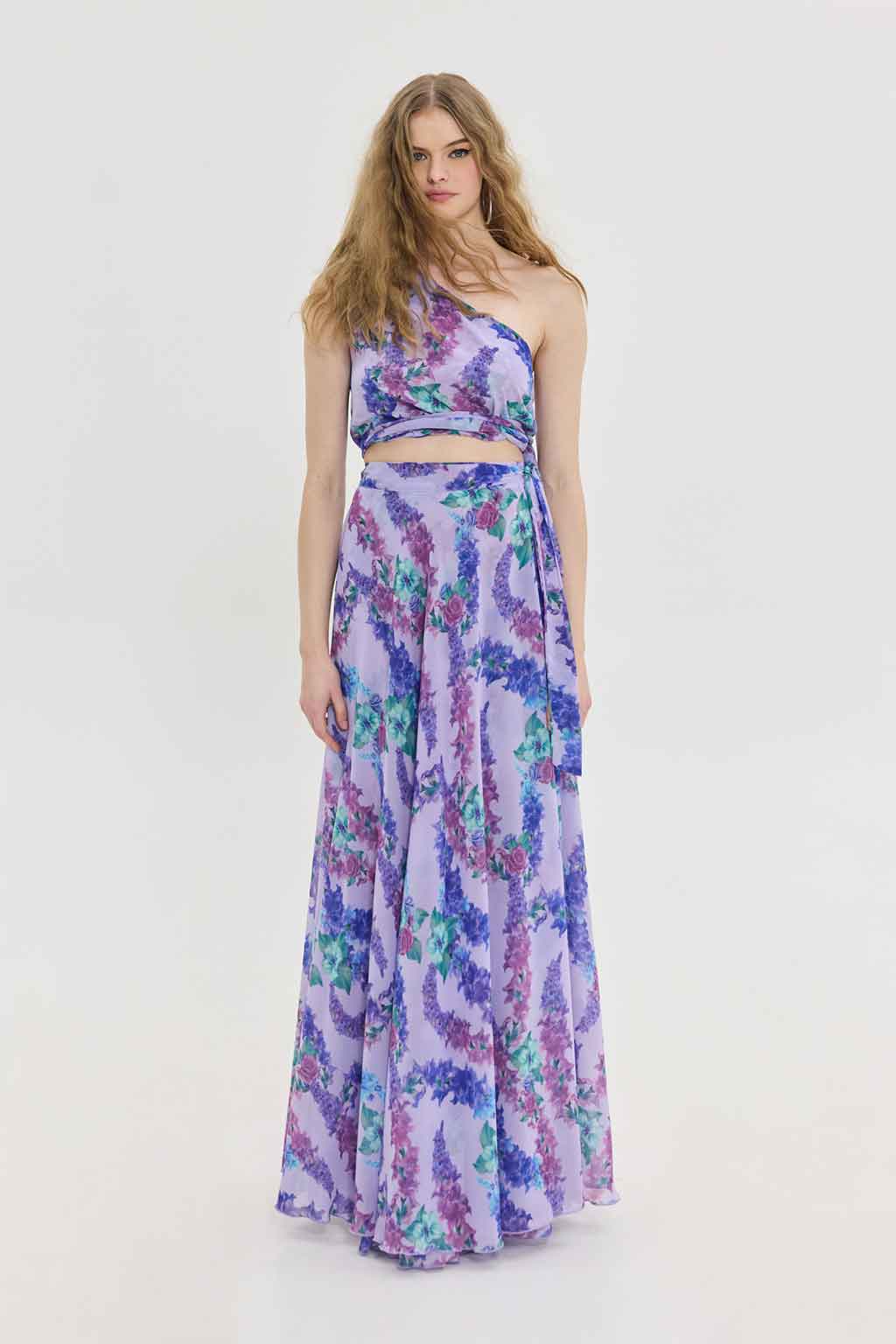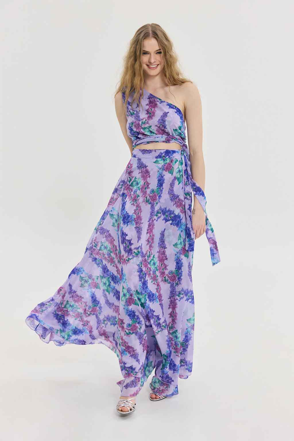 Crop top ένας ώμος, floral pattern μωβ, κρουαζέ wrap κλείσιμο, πιέτες, ζώνη στήθος, 100% Rec PL.