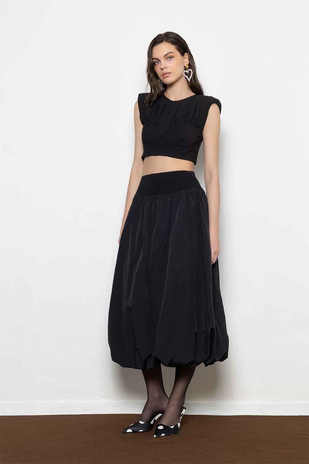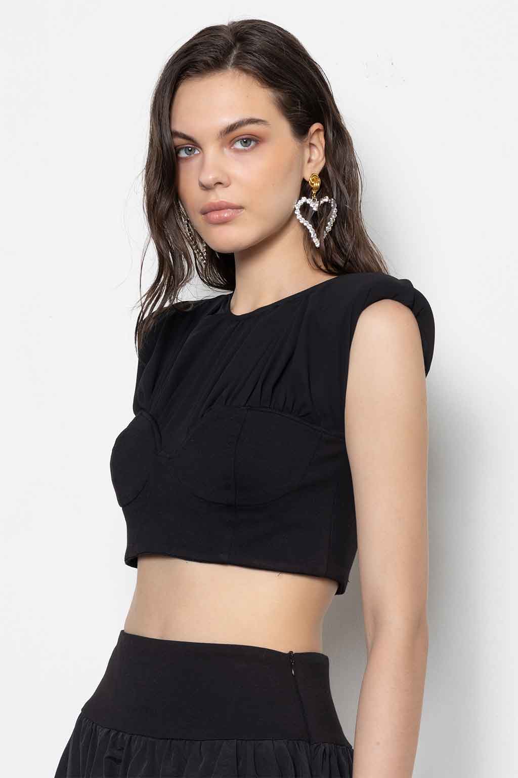 Sculpted μαύρο crop top με σούρες στο μπούστο και τονισμένους ώμους — κομψό, τολμηρό και αβίαστα cool. Ύφασμα: 68% Ράιον, 27% Πολυαμίδιο, 5% Spandex & 68% Ανακυκλωμένος Πολυεστέρας, 32% Πολυεστέρας. Το μοντέλο φοράει μέγεθος S.