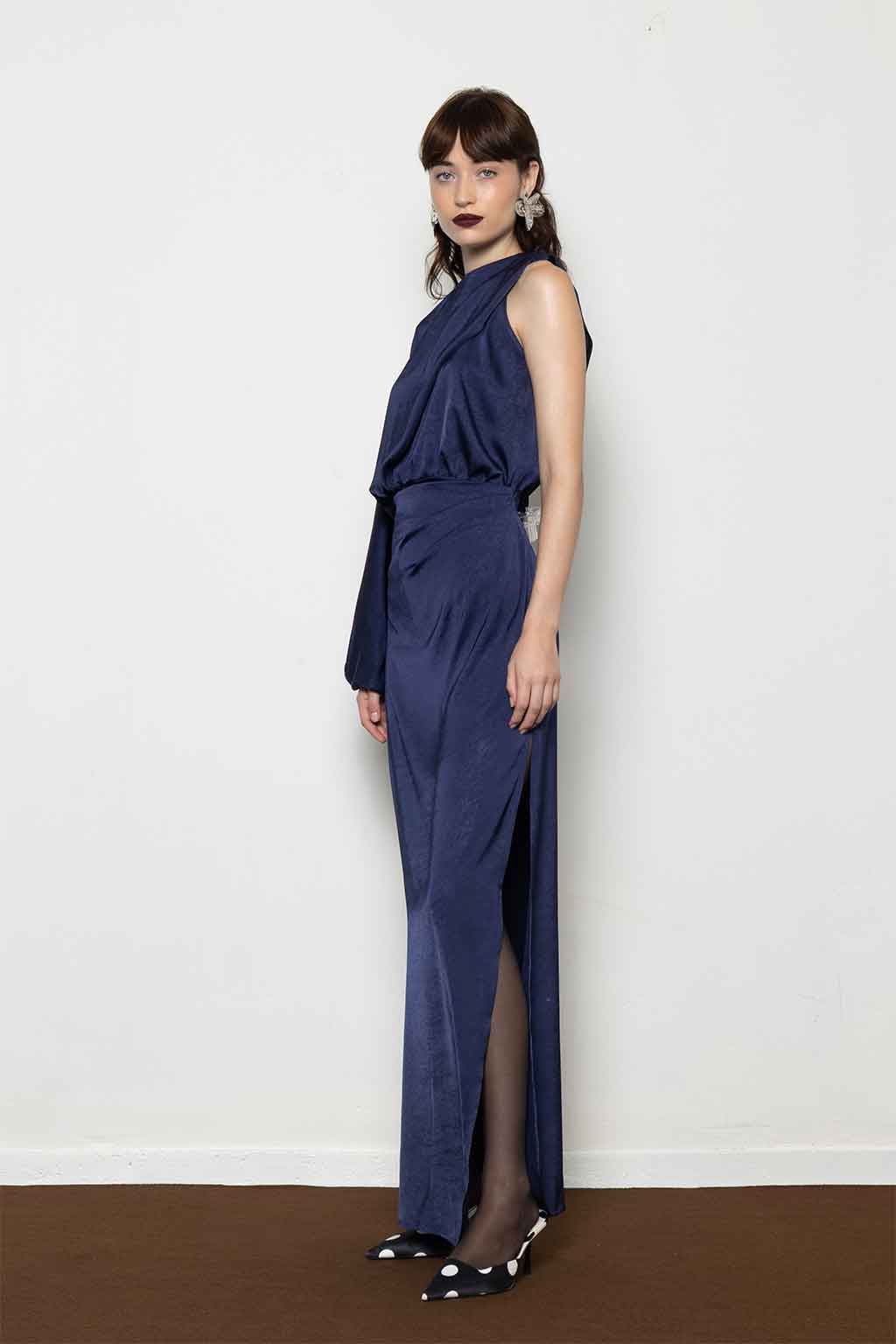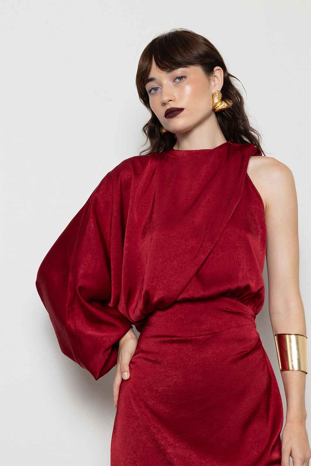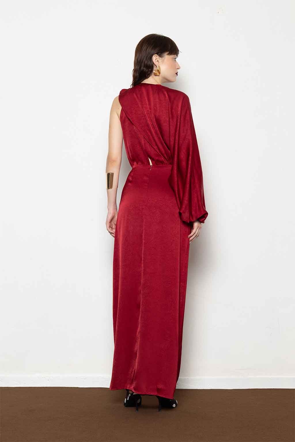 Ασύμμετρο σατέν φόρεμα σε σκούρα οινική απόχρωση με έναν εντυπωσιακό όγκο στο μανίκι και ψηλή λαιμόκοψη — γλυπτικό, δραματικό και τολμηρό. Μια statement σιλουέτα για βραδινή κομψότητα. Ύφασμα: 100% Πολυεστέρας. Το μοντέλο φοράει μέγεθος S.