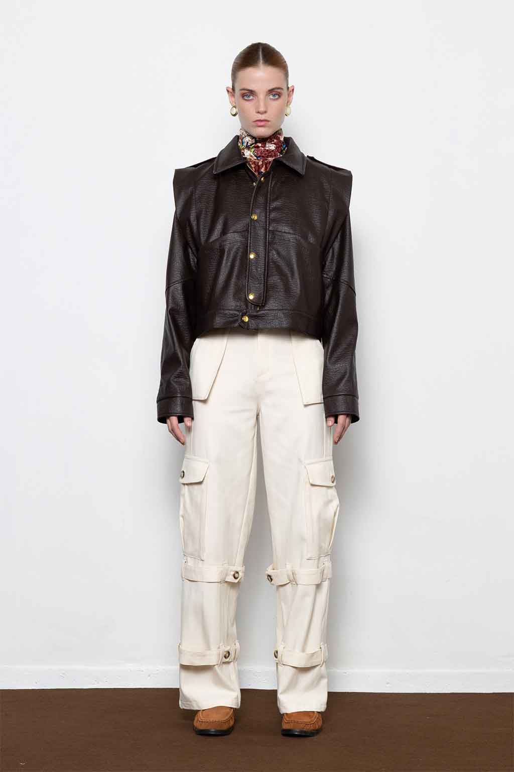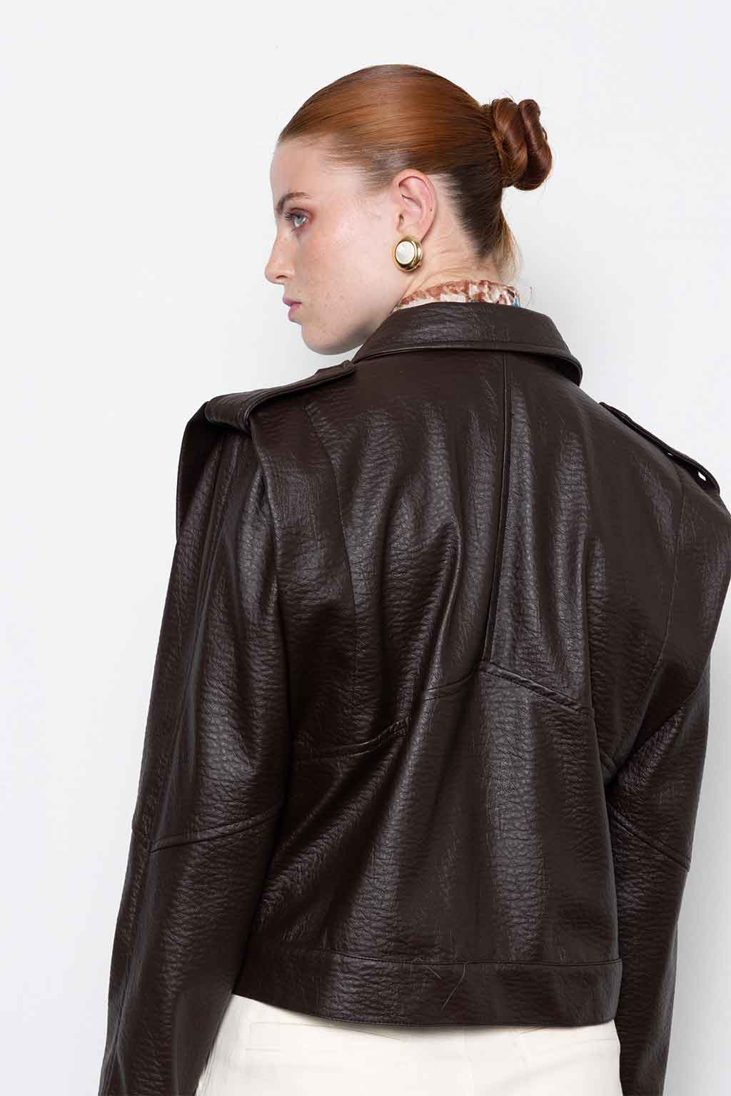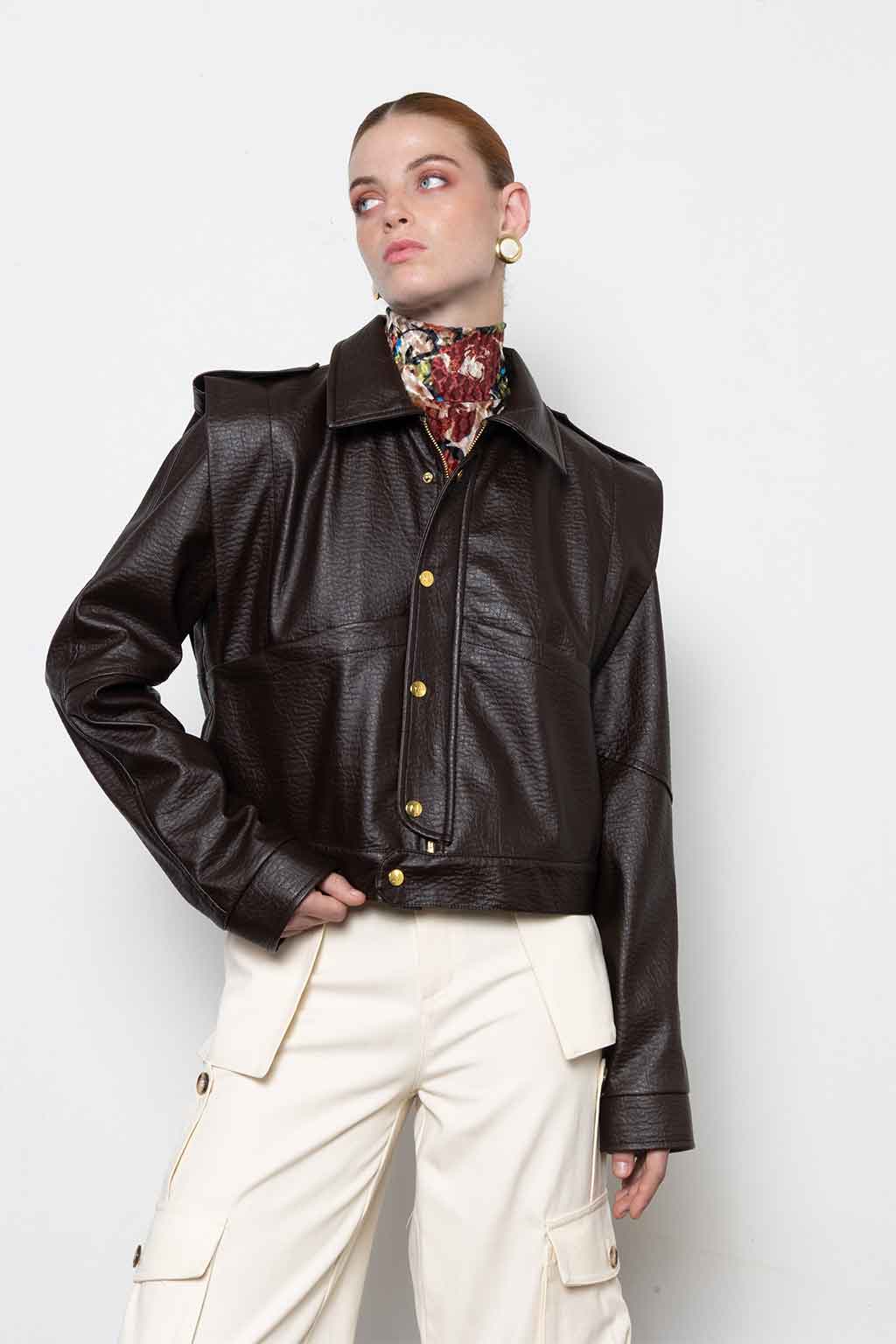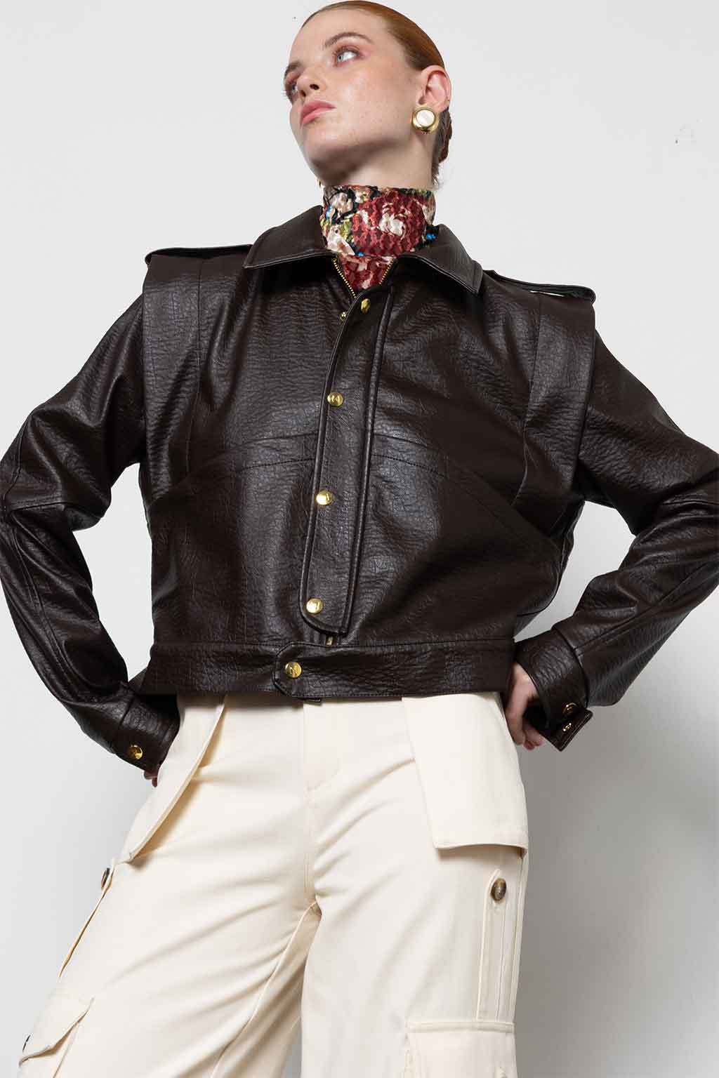 Modern armor. Δομημένο jacket από συνθετικό δέρμα με χρυσές μεταλλικές λεπτομέρειες — σχεδιασμένο για να επιβάλλει την παρουσία με αβίαστη κομψότητα. Ύφασμα: 60% Πολυουρεθάνη, 40% Πολυεστέρας. Το μοντέλο φοράει μέγεθος S.