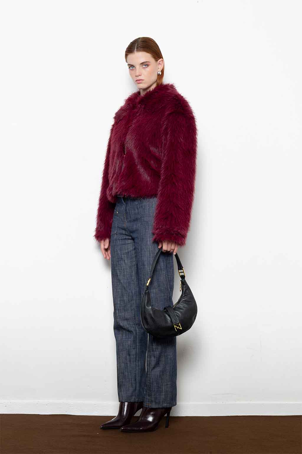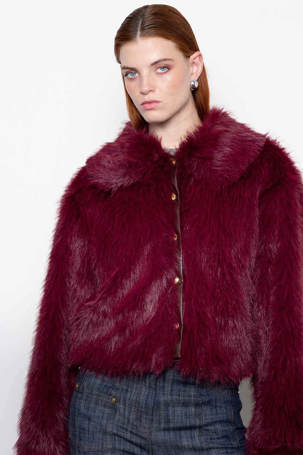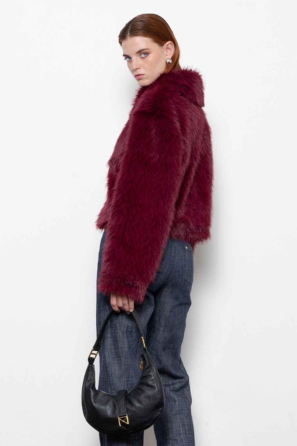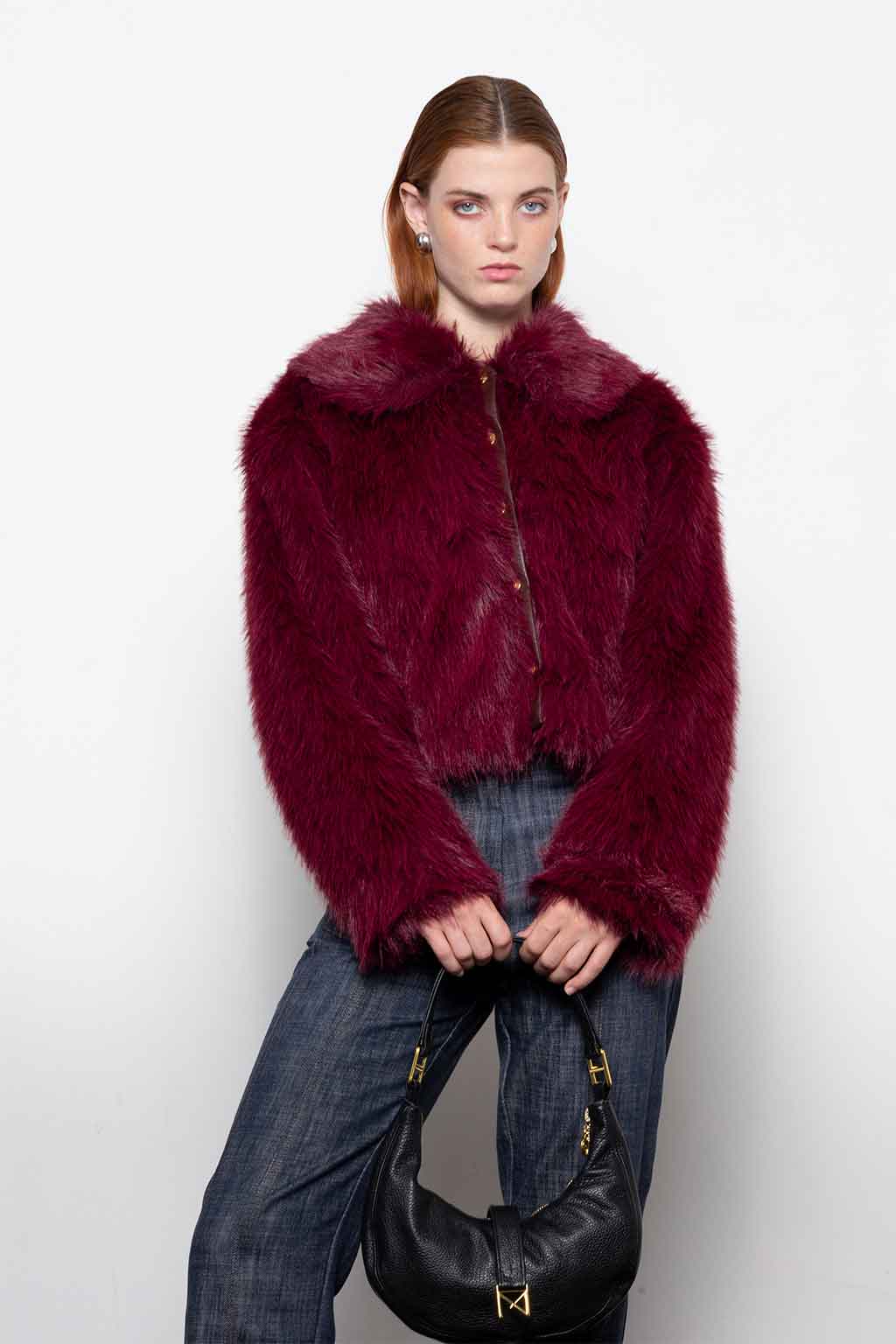 Κοντό jacket από συνθετική γούνα σε βαθύ μπορντό — αφράτο, παιχνιδιάρικο και ιδανικό για να αναβαθμίσει κάθε χειμερινό look. Ύφασμα: 100% Πολυεστέρας (γούνα) & 100% Πολυουρεθάνη, 100% Βισκόζη. Το μοντέλο φοράει μέγεθος S.