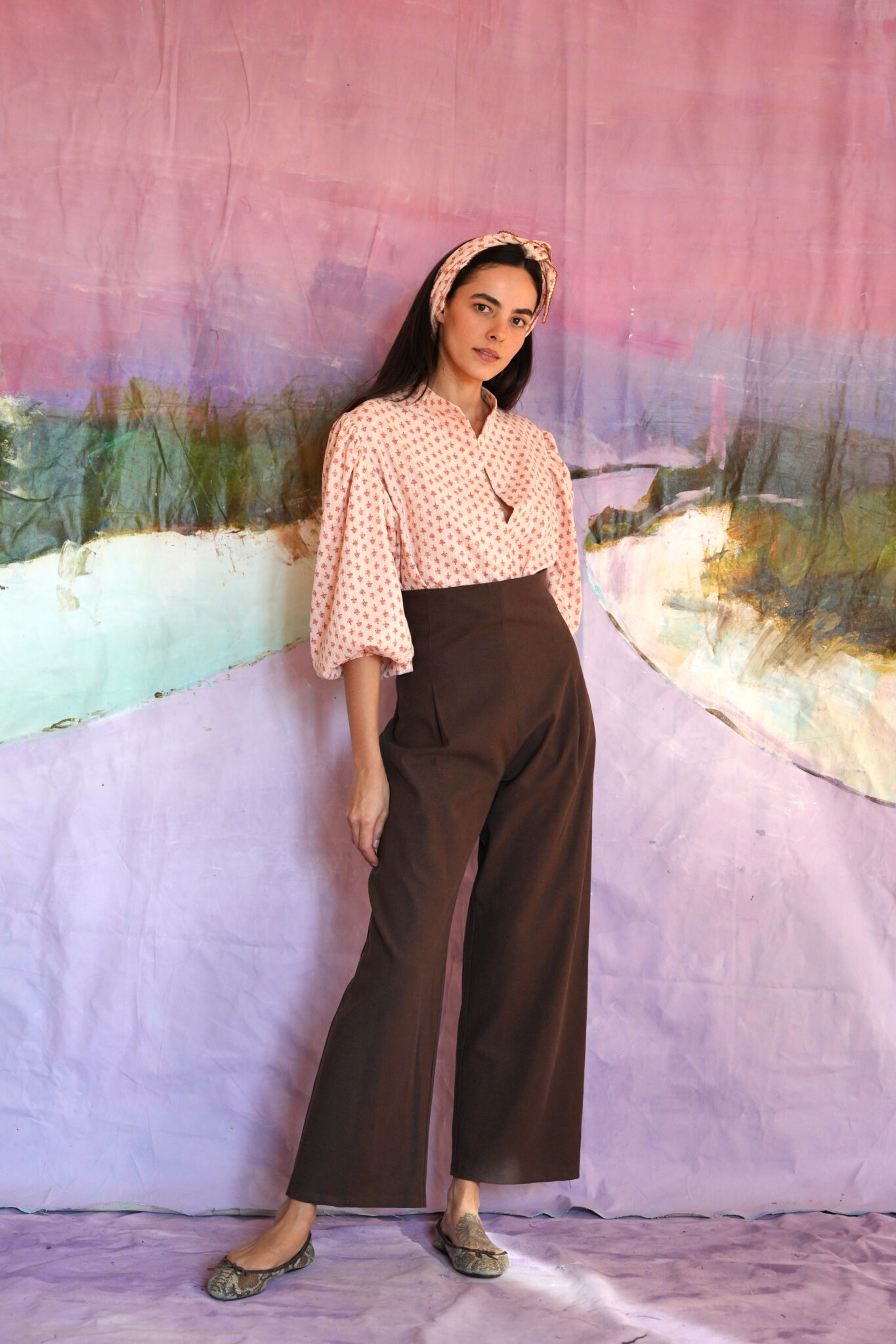 Rosa shirt με mao γιακά και balloon μανίκια, σε 100% cotton.