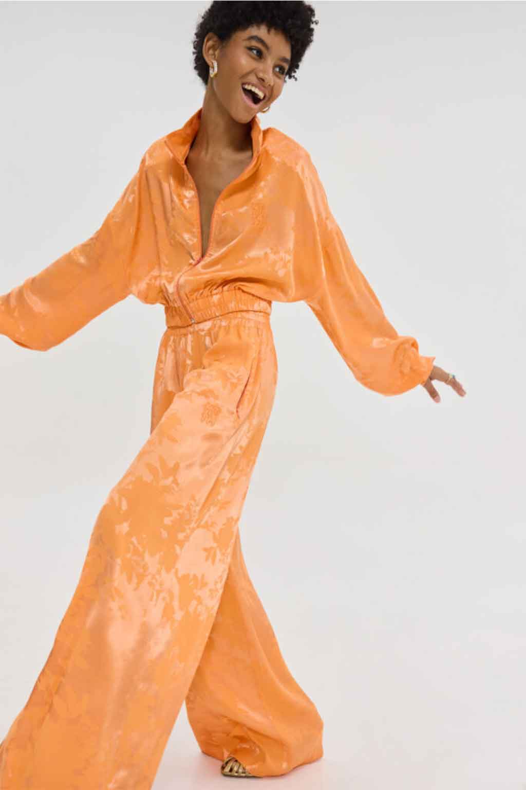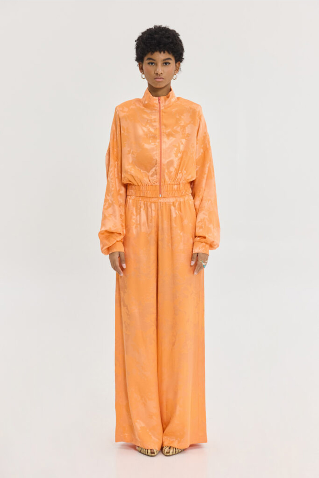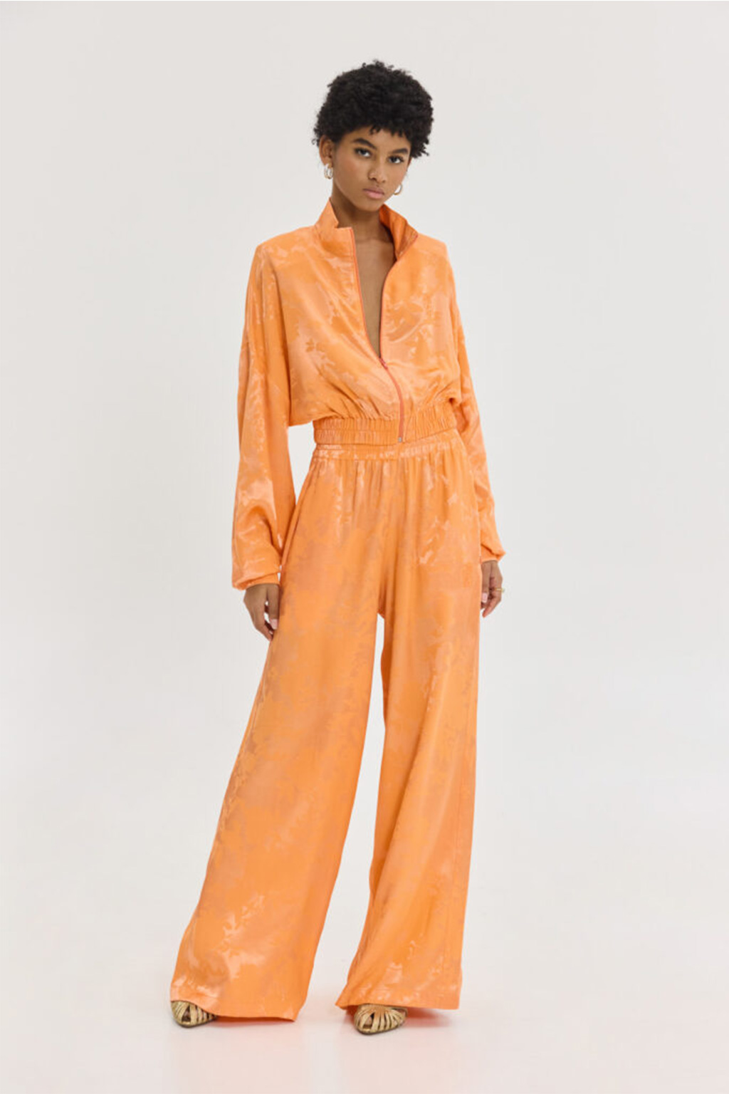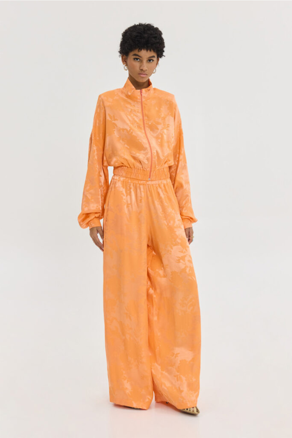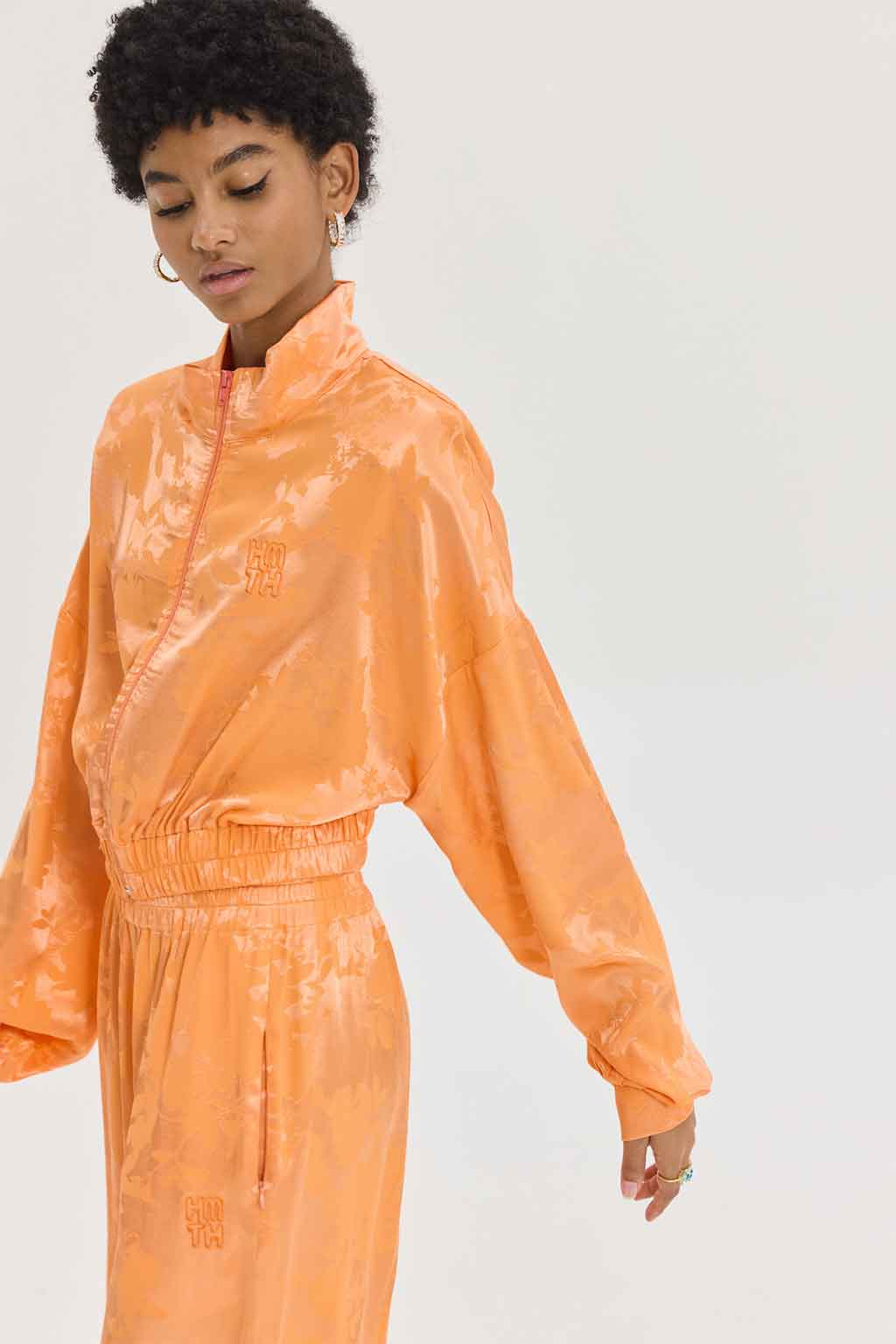 Cropped, σατέν ζακάρ μπουφάν, bright orange με φλοράλ pattern, tone-to-tone κέντημα, cropped, 58% VIS 42% PL.