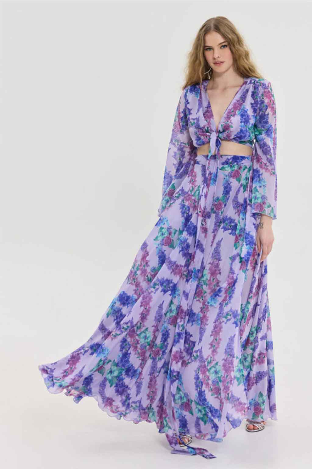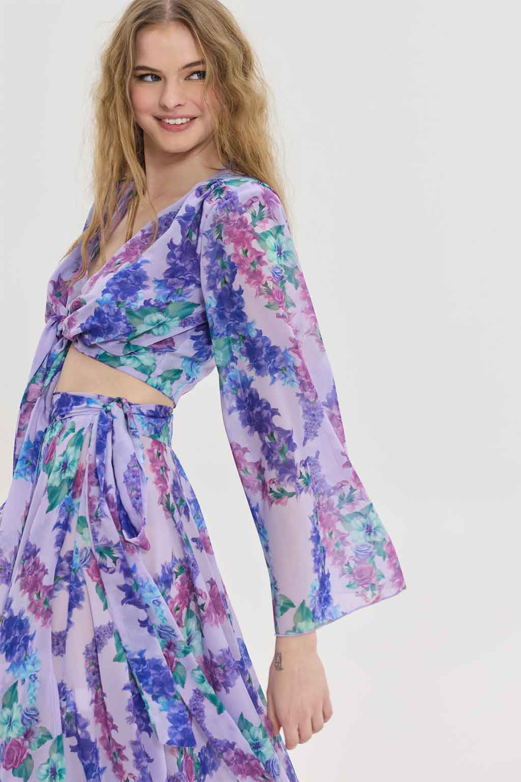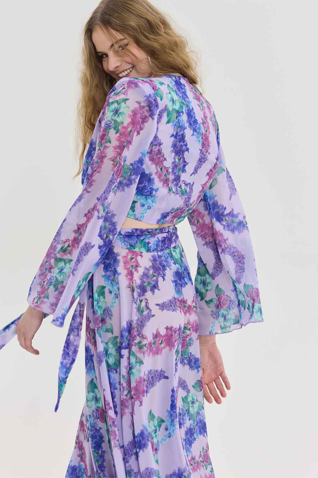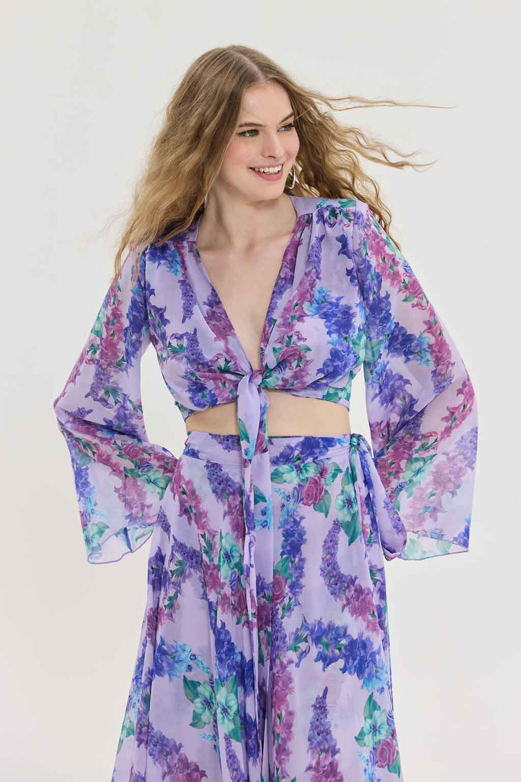 Μακρυμάνικο crop top, dragon flowers & roses pattern, wrap κλείσιμο, μανίκια καμπάνα, διπλό ύφασμα, 100% Rec PL.