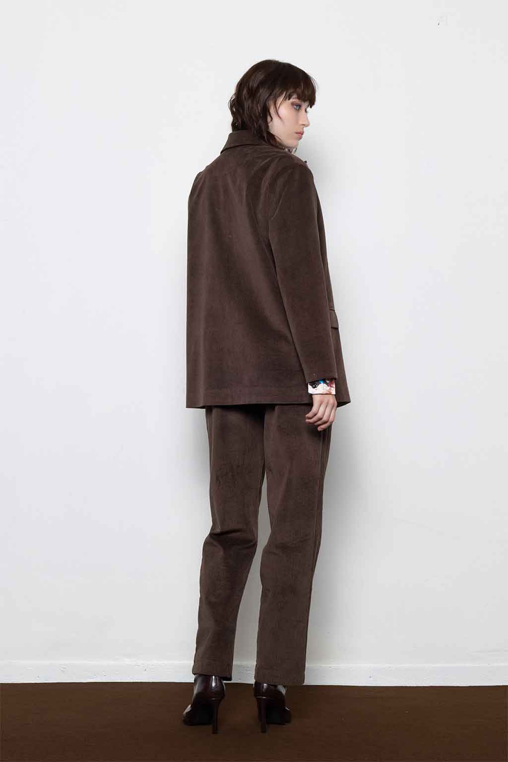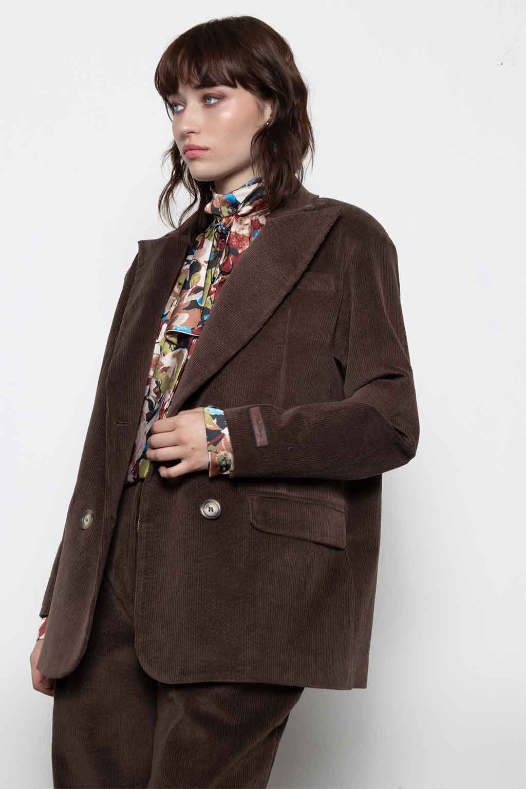 Tailored confidence. Σακάκι από σοκολατί κοτλέ με κοφτές πέτες, διπλό κούμπωμα και δομημένη εφαρμογή — ένα μοντέρνο κλασικό με vintage ψυχή. Ύφασμα: 97% Βαμβάκι, 3% Ελαστάνη. Το μοντέλο φοράει μέγεθος S.